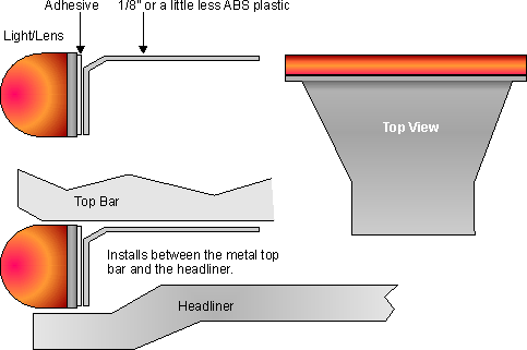 | The Truck-Lite unit has an adhesive strip along the back for mounting. I made a crude mount from ABS plastic then stuck the light to it. The mount was then placed between the liner and the roof frame. I cannot remember if the bracket was screwed into the frame or just help in by he liner. |