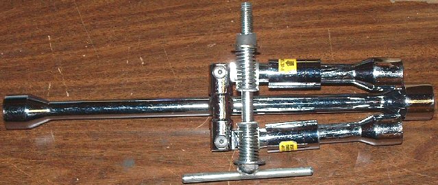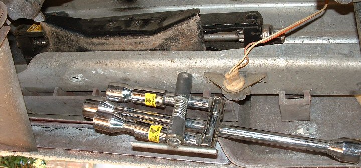 why not put it near the tire. The interior of the 'C' channel rear bumper would make an ideal location to fit the jack. This left the problem of where to put and how to attach the original lug wrench. After some thought the original wrench was replaced in favor of a inexpensive Wal-Mart chrome four way folding lug wrench. This was a better fit as the wheel lug nuts and lock lug nuts required two different wrenches to remove them anyway. Below was the original design. A friend welded the 'T' handle on to a 3/8" x 6" NC bolt. Two conduit retainer hooks were installed to grab the loose wrench arms. |
