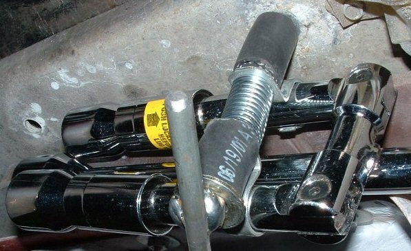 | In order to make this an efficient system a single retention method was desired to hold the lug and the jack. A hole was drilled in the base of the jack. Then a nut welded on the upper side of the base. This would have no affect on the function of the jack. The lug wrench retainer bolt then would feed through a hole in the bumper and screw into the welded nut. The full mounting is shown below. |